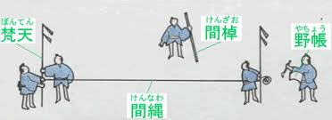 | 徳川家康は江戸入国(1590年)と同時に大手門前に作業小屋を設置し浜松城の築城にも関わった「木原吉次・重次」親子に江戸の土木工事の実施計画案を作成させました。そして初の江戸町奉行に「天野三郎兵衛康景」を総責任者とし任命しそおの、配下に普請奉行や地割奉行(測量担当責任者)も任命し、新しい江戸の町づくりをスタートさせました。 先ずは町作りの基本である測量は「方位と距離」の測定でした。方位の測定は北極星を目印にする古くから伝わる方法で行われました。測定した北の方向を基に四方を30度ずつ十二等分して十二支【子・丑・寅・辰・巳・午・未・申・酉・戌・亥】に充て、北=子、東=卯、南=午、西=酉となります。【図1参照】 距離の測定は、尺【約30.3cm】と間【6.5尺=約1.97m(京間)】を目盛った 間竿と水縄が使われました。間竿は二間以内の短い距離を測る木製の物差しです。水縄はそれ以上の長い距離を測る道具で、太さ5ミリ程の縄で作られた巻尺です。【図2参照】 測定した方位と距離を計画案に従って定め「道や堀」の位置を決めていく。特に堀は建築物資・生活物資を大量に運ぶために重要であり、平川河口から江戸城大手門近くまでの道三堀が、計画の一番最初に掘られました。続いて千葉・行徳から主に塩を運ぶために隅田川の東に小名木川が掘られました。【図3参照】 また、海辺の町作りであったので塩害などで良質の飲料水が得られないために小石川沼から水を引いて飲料水とする「神田上水」が誕生し。赤坂溜池の飲料水化も進められました。 こうして江戸湊の海辺の原野に計画された江戸の町作りは、大土木工事が多方面に展開した結果、やっと人々が住むことのできる場所に変化していきました。 |